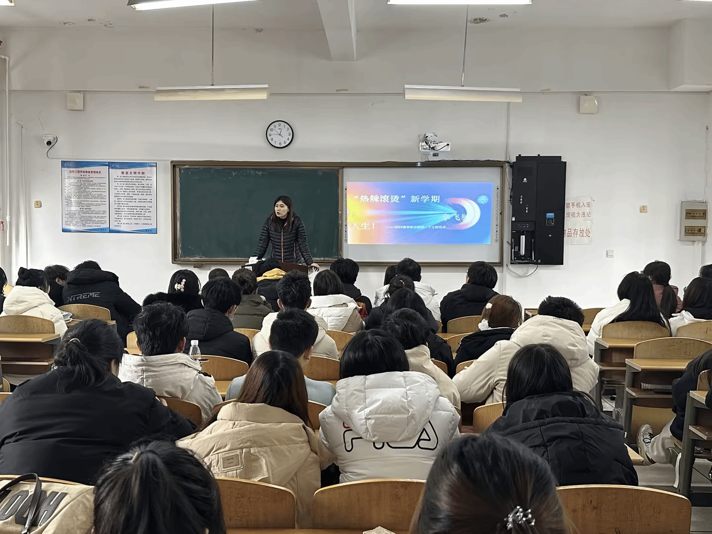 “安全无小事,生命重如山”,安全是每位学生完成学业的保证。为了强化学生在新的一学期的安全意识。为针对在校学生的安全问题,辅导员柴乐从宿舍防盗、消防安全、电信诈骗、人身安全四方面分别举例说明以深化学生的安全意识。以“平安校园在我心,安全行动手中行”为宗旨,提高学生对生命的尊重和敬畏意识,防止悲剧的发生,联手共筑安全港湾。辅导员王松媛借鉴了电影《热辣滚烫》的元素引导同学们认识到“一切来得及,记得爱自己”,更是向同学们承诺“你不是一个人,我永远在你身后”,引导同学们关注自身健康,培养良好的生活习惯,学会调节负面情绪,并鼓励同学们勇敢面对困难挑战,积极寻求帮助支持。