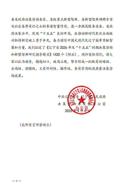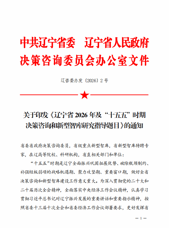 【转】关于印发《辽宁省 2026 年及“十五五”时期 决策咨询和新型智库研究指导题目》的通知 2026年03月07日 13:11 作者: 点击量: 下一条:关于2025年国家社会科学基金年度项目申报工作的通知 附件【关于印发《辽宁省2026年及“十五五”时期决策咨询和新型智库研究指导题目》的通知).pdf】已下载次